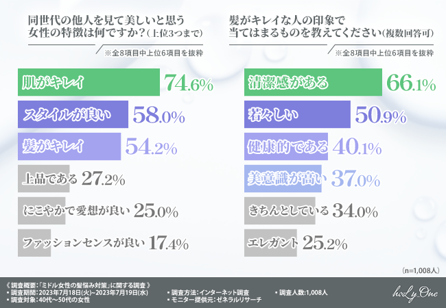 一方で、『髪がキレイ』と回答した方も半数以上いたことから、ミドル女性の“キレイの決め手”は肌と髪がポイントのようです。