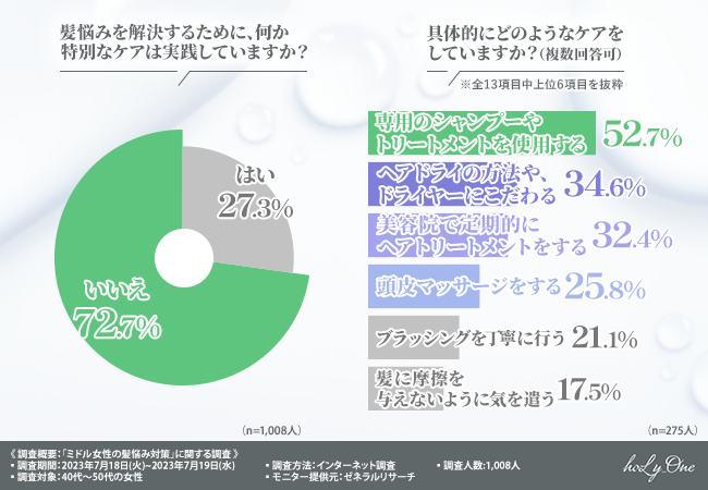 一方で、2割強の女性は髪悩みに対して特別なケアをしていますが、どのようなケアをしているのでしょうか。