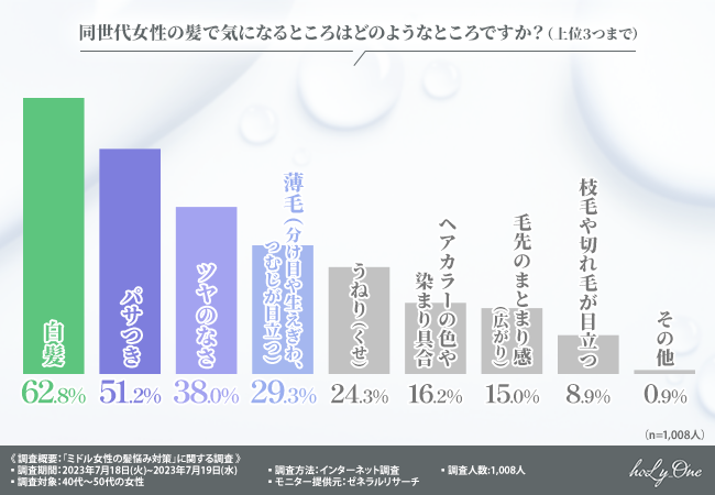 今回の調査では、若い頃には無かった白髪やくせ毛、うねりといった「髪質の変化」に悩んでいる40代~50代の女性が多いことが明らかになりました。
