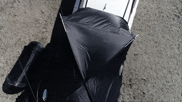 急な雨でも安心のタープが「カーレックス」には付いてます。(縦160cm横250cm)