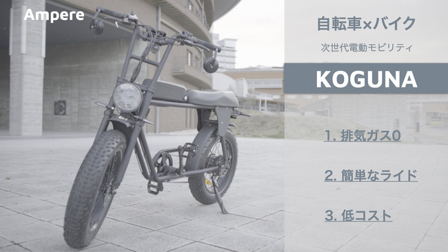 KOGUNAは、自転車とバイクのいいとこ取りをした次世代電動モビリティで、自転車のように手軽かつ、自転車では少し遠いと感じる5km~20kmの移動に適しております。楽しく効率的で快適な短中距離移動のモビリティとして、「Last One Mile」問題解消や、コロナ禍の新しい移動スタイルの提案をしていきます。