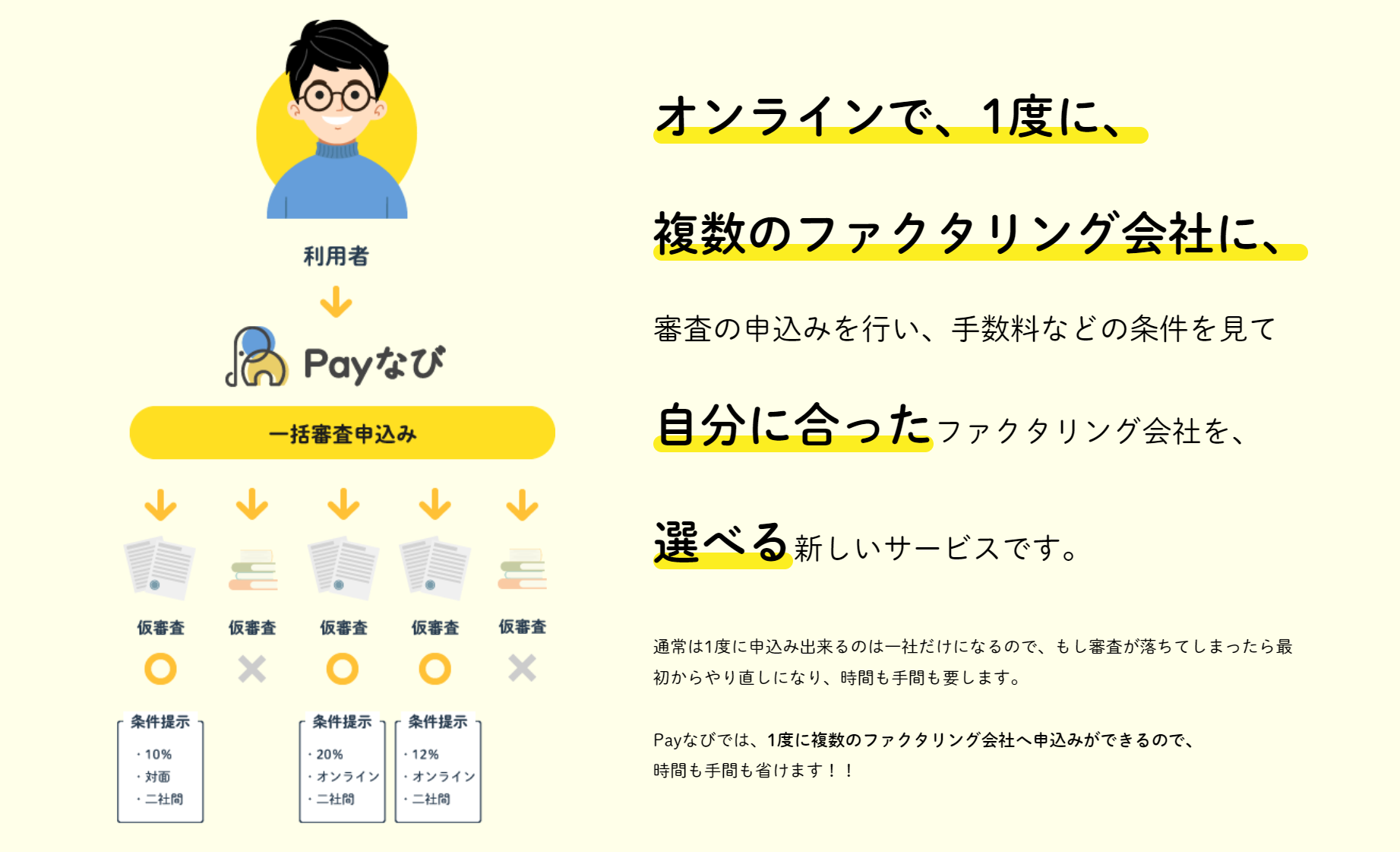 そんな中「Payなび」なら1度の申請で複数のファクタリング会社に審査の申し込みが可能で、審査のやり直しなどの時間と手間を大幅に削減可能です。