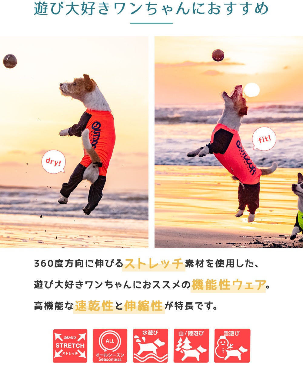 360度方向伸びるストレッチポリエステル素材を採用し高機能な速乾性と伸縮性を兼ね備えた機能性ウェアとなっております。オールシーズンでご使用頂けますので水遊びや山遊び、雪遊びなど愛犬愛猫の体調管理もしっかり行えます。