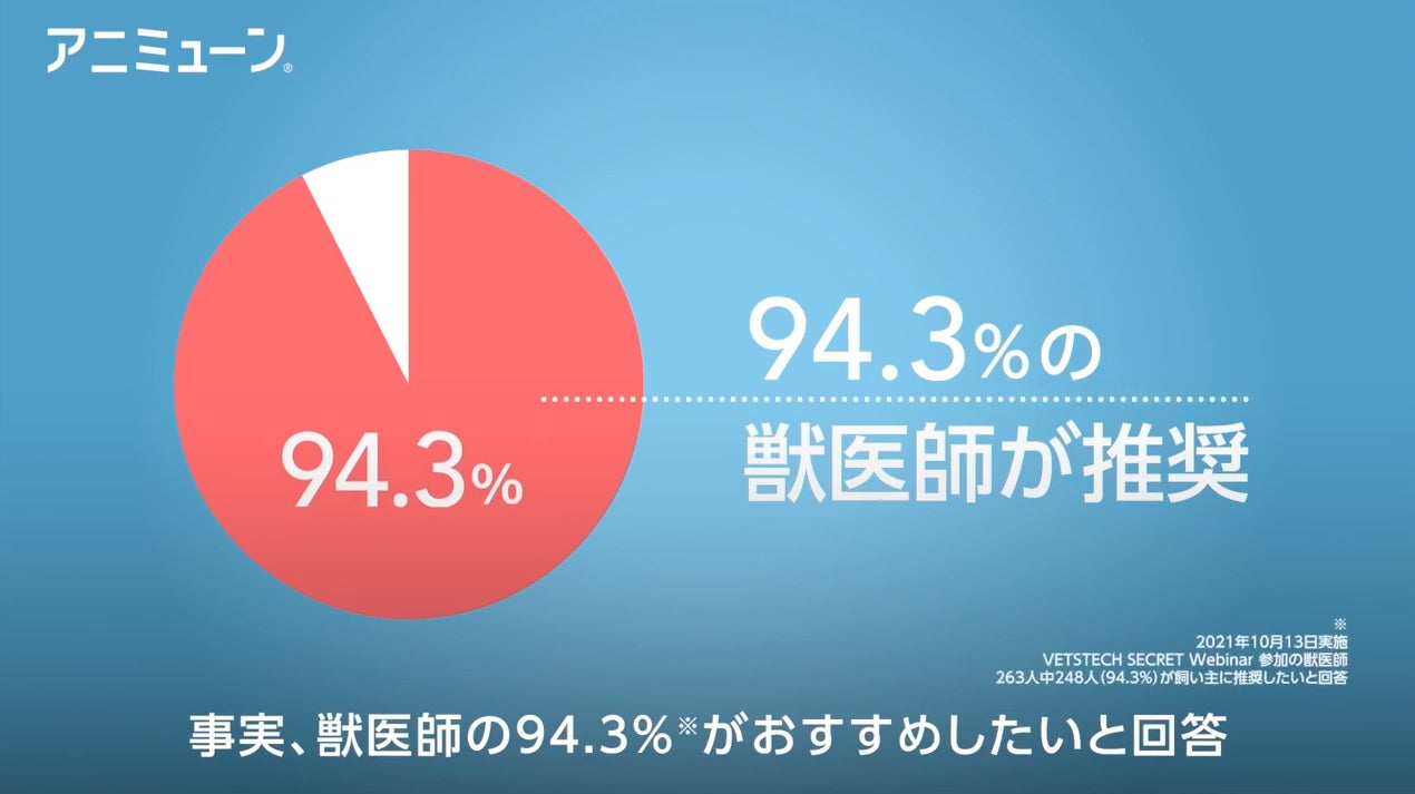 * 調査元:2021年10月13日実施 VETSTECH SECRET Webseminar 参加の獣医師263人中248人(94.3%)が飼い主に推奨したいと回答