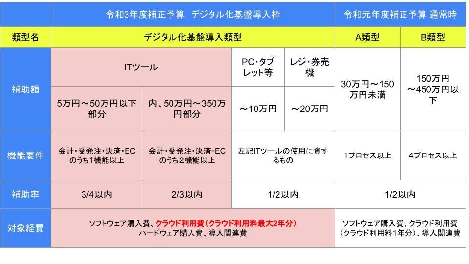 デジタル化基盤導入枠とは、会計・受発注・決済・ECのうち1機能を満たした場合、50万円以下のクラウド利用料が2年分補助され、更に2機能以上を満たす事で350万円分が補助の対象となります。