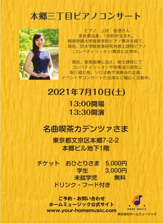 株式会社ホームミュージック(代表取締役 李泳燦)は2021年7月10日、本郷三丁目の名曲喫茶カデンツァさまにて上田佳澄さんによりますピアノコンサートを開催致します。13:00開場、13:30開演。お食事とお飲み物つきでおひとりさま¥5,000、学生¥3,000、未就学児無料。クラシックからディズニーまで、幅広い名曲をお届け致します。お問合せ・ご予約はホームミュージック公式サイトhttps://www.your-homemusic.comまで。