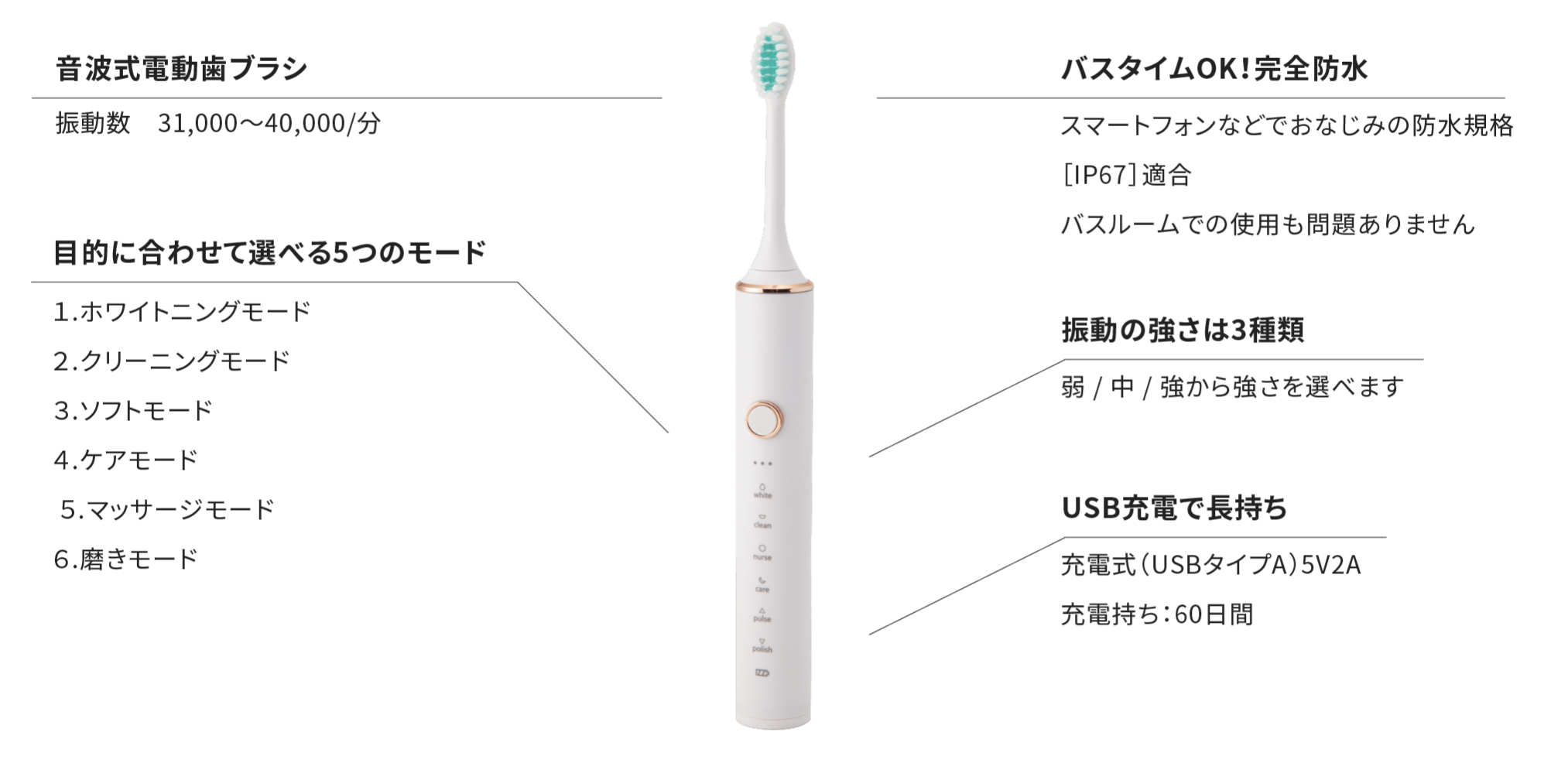 35,000回/分の音波振動で、手磨きでは実感できないツルツル仕上げに。5つの振動モードを搭載し、歯と歯ぐきの健康と美容をサポートします。