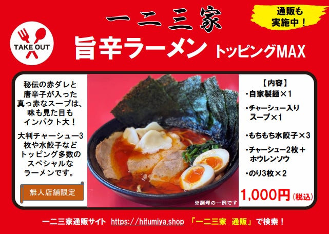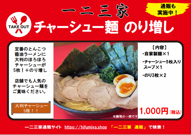 自宅での食事の機会が増えた新しい生活様式に合わせて、「一二三家」も店舗経営のみならず早々にラーメンの冷凍化に成功させ、通販サイト(https://www.hifumiya.shop/)にて販売を開始。