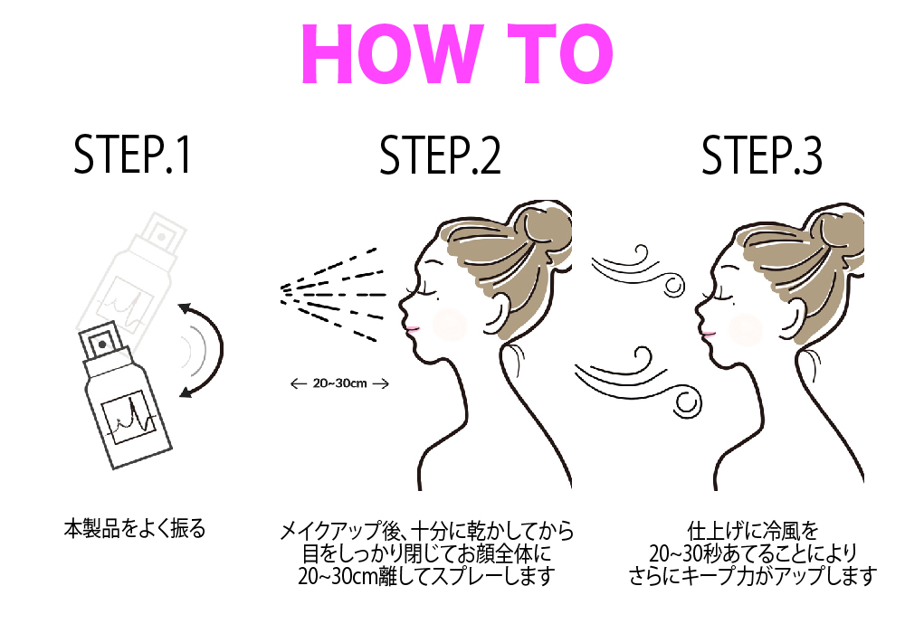 (2)メイクアップ後、十分に乾かしてから目をしっかり閉じてお顔全体に20~30cm離してスプレーします。
