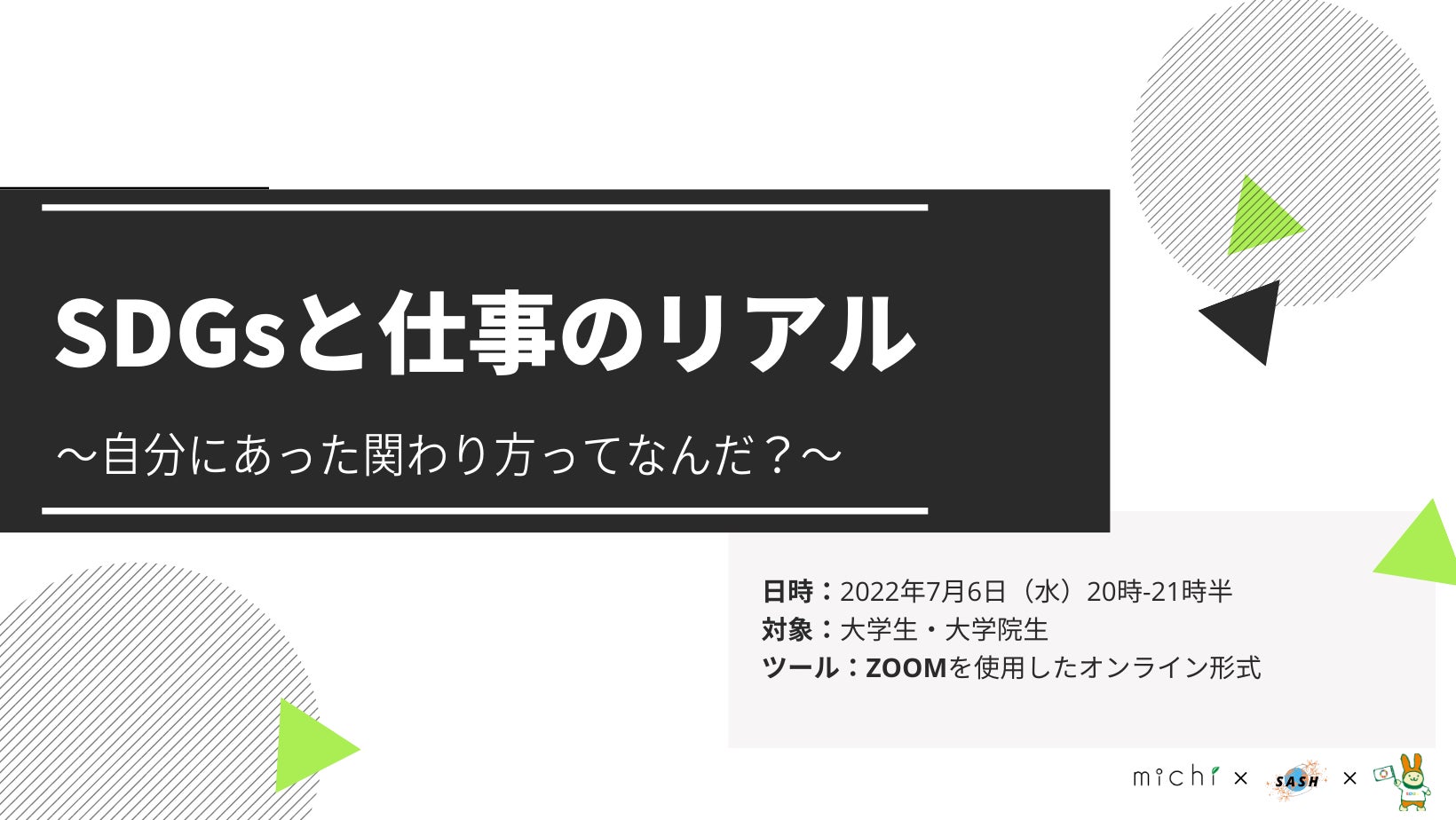 「自分らしい生き方をする人を増やす」を経営理念として活動する一般社団法人michi(本社:東京都渋谷区、 代表:小林 佳奈)は、法政大学SDGs+(プラス)プロジェクト、法政大学公認学生組織SASHとの共催にて、 「SDGsと仕事のリアル ~自分にあった関わり方ってなんだ?~」を開催しました。