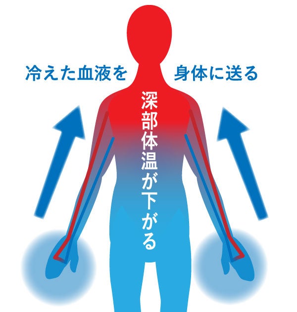 手の平には体温調整の役割を担う「動静脈吻合(AVA)」という特殊な血管があります。人は暑さを感じるとこのAVAを拡張させて血流量を増やして熱を放散させています。この状態の時に手の平を冷やすと冷えた血液が多量に身体に送られ、結果として深部体温(体の内部の温度)を低下させることができると言われています。