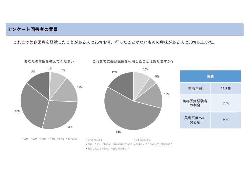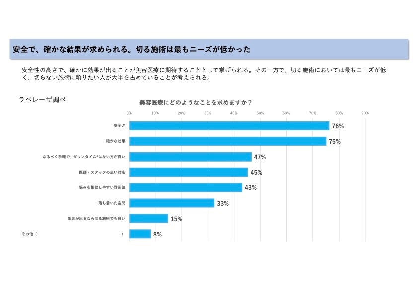 本アンケートではおよそ80%の人が美容医療への関心があると回答していたが、美容医療に求めるのは安全で確かな効果が得られることが最も多く、リスクなどが低く医療ならではの効果の高さに関心があると考えられる。一方で、効果が出るなら切る施術でも良いと回答した方はわずか15%であり、『確かな効果』は求めつつもメスを入れるような施術までは求めないことが分かった。