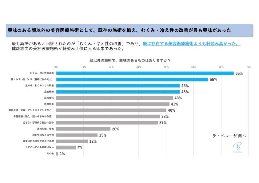 上位4項目に、血流に起因する症状の改善に興味があるという回答が挙がり、『むくみ・冷え性の改善(65%)』『痩せやすい体づくり(基礎代謝の向上)(55%)』『足やせ(むくみ太りの解消)(45%)』『血流改善(45%)』の順番となった。既存の美容施術を抑え、美容医療で血流を改善する新しい可能性が発見された。