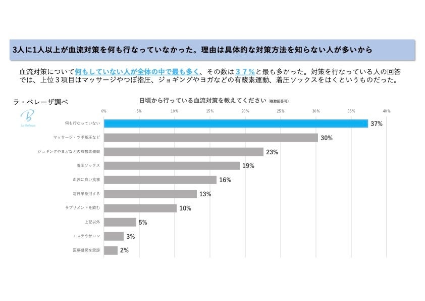 日頃の血流対策は、『マッサージ・ツボ指圧(30%)』『ジョギングやヨガなどの有酸素運動(23%)』『着圧ソックスをはく(19%)』などが挙がったが、最も多い回答だったのが、『何も行なってない(37%)』であった。