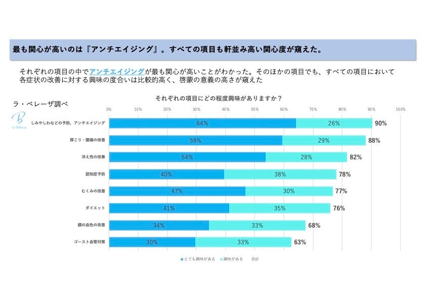 ・血流を改善することで得られる項目に対する関心については、『しみやしわなどの予防、アンチエイジング(90%)』と最も高く、その他すべての項目においても比較的高い関心の高さが窺えた。