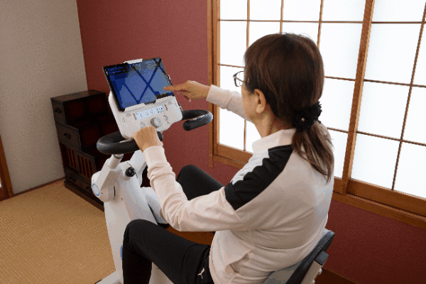 アプリを使った「頭の運動」とフィットネスバイクを使った「体の運動」の2つを同時に行い、「デュアルタスク効果」として脳の訓練を促します。