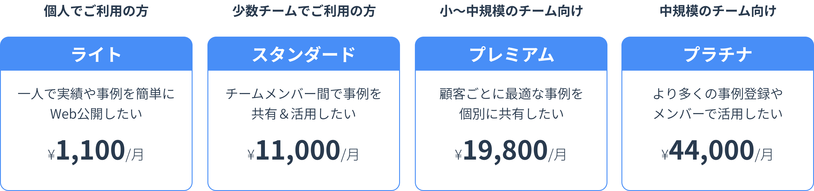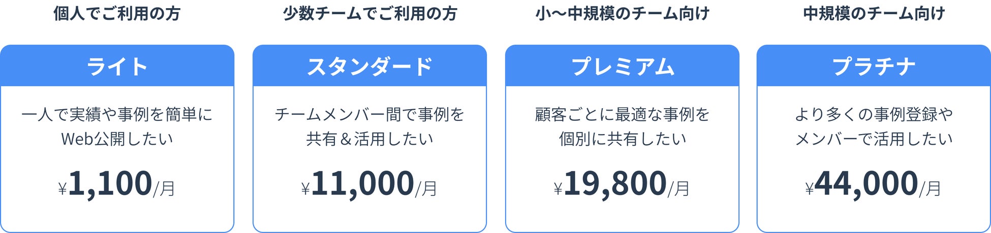 利用形態に応じた4つのプランをご用意しています。法人・個人問わず、1名様からでもご利用いただけます。なお、初めてご登録のお客様には、30日間無料トライアルを提供しています。まずは無料で30日間お試しください。