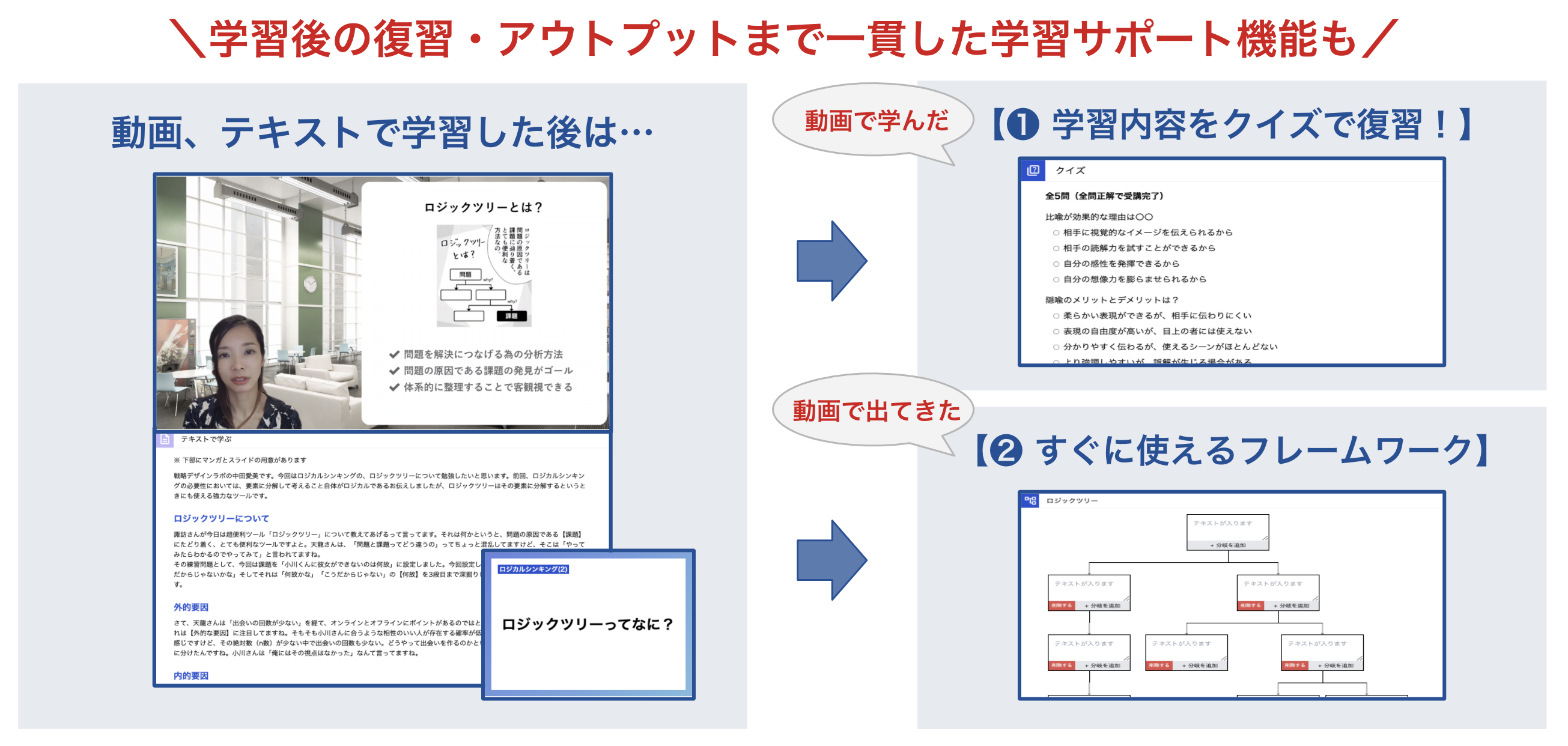 本サービスはインプットのコンテンツの質の高さだけでなくアウトプットの仕組みまで整えています。講座でインプットをしたあとは、クイズで復習。勉強した豊富なテンプレートはすぐに実務で活用できます。さらにウェビナー形式のケーススタディ等でアウトプット・実践の機会を作ります。