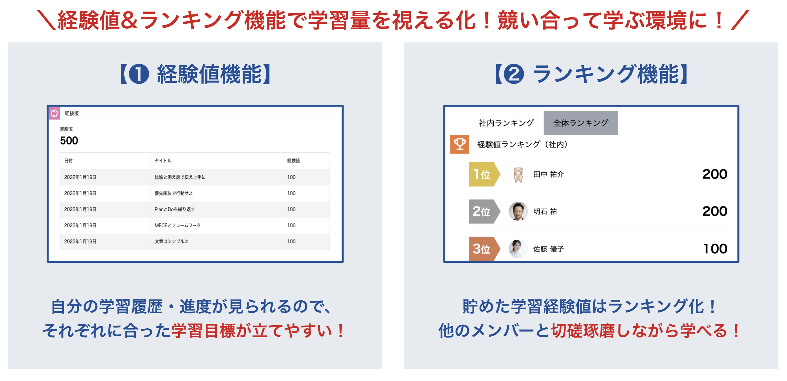 経験値によるランキング制度を設けることで、自社内外の参加者と競い合うことができ、学びの意欲がさらに高まります。