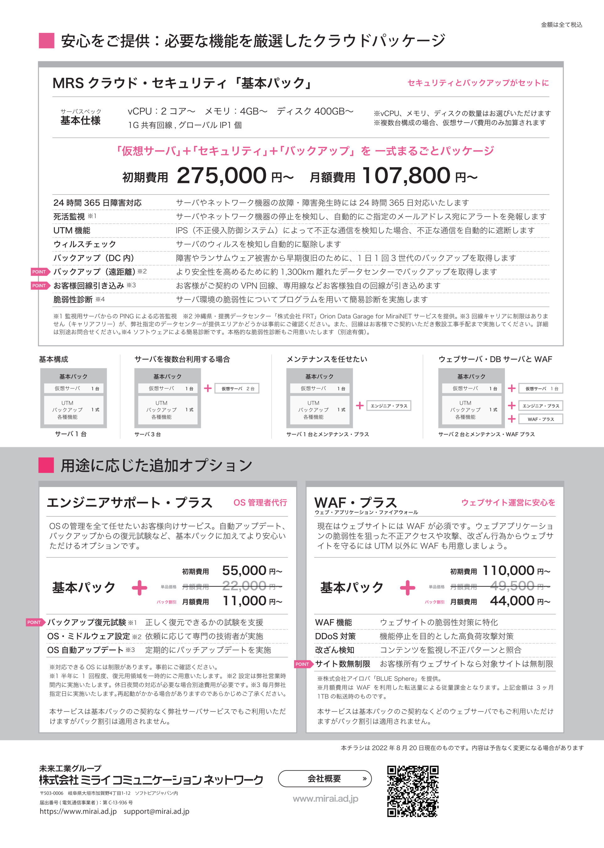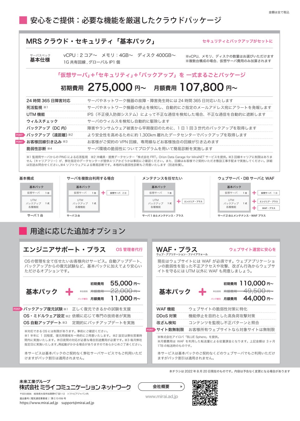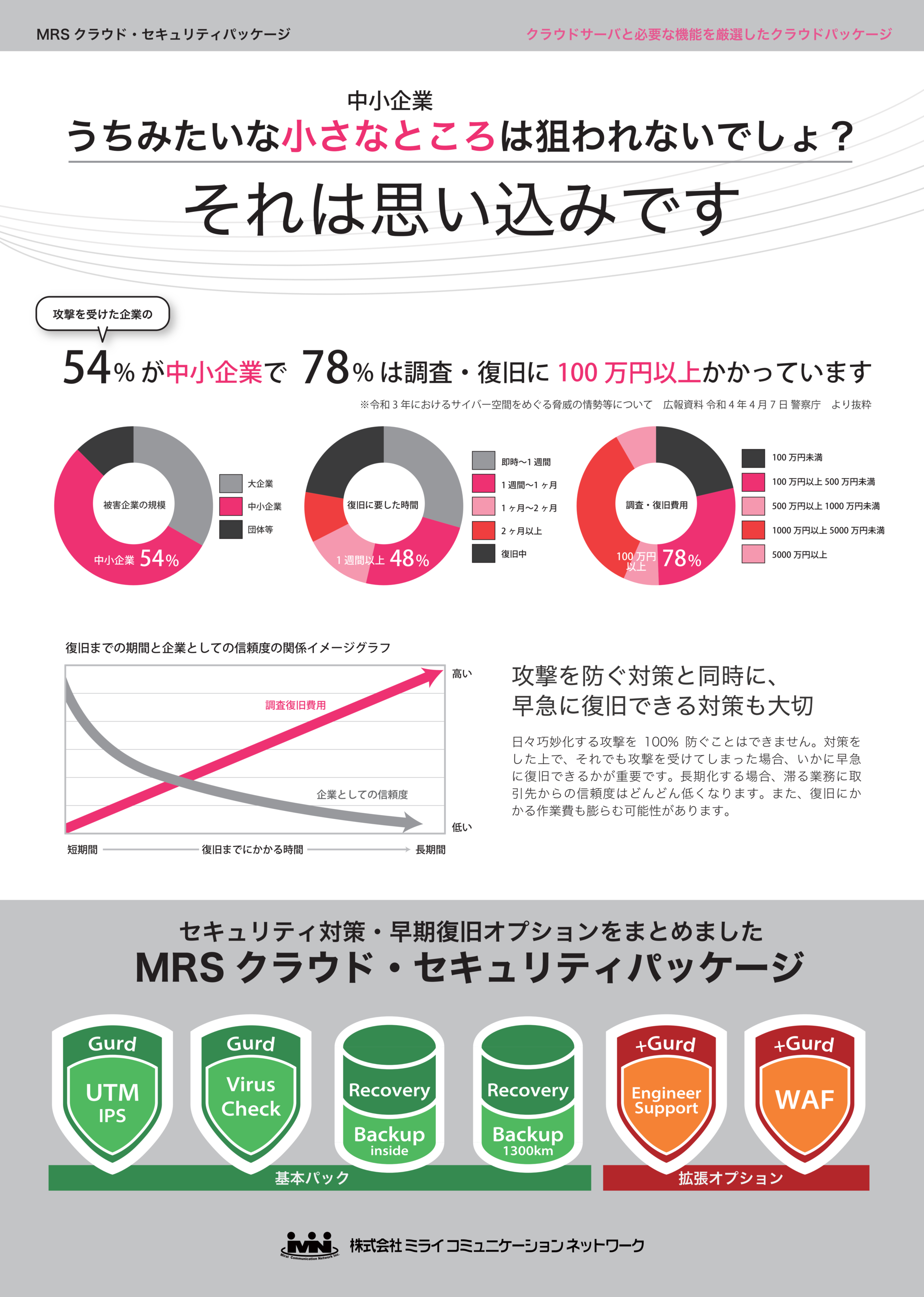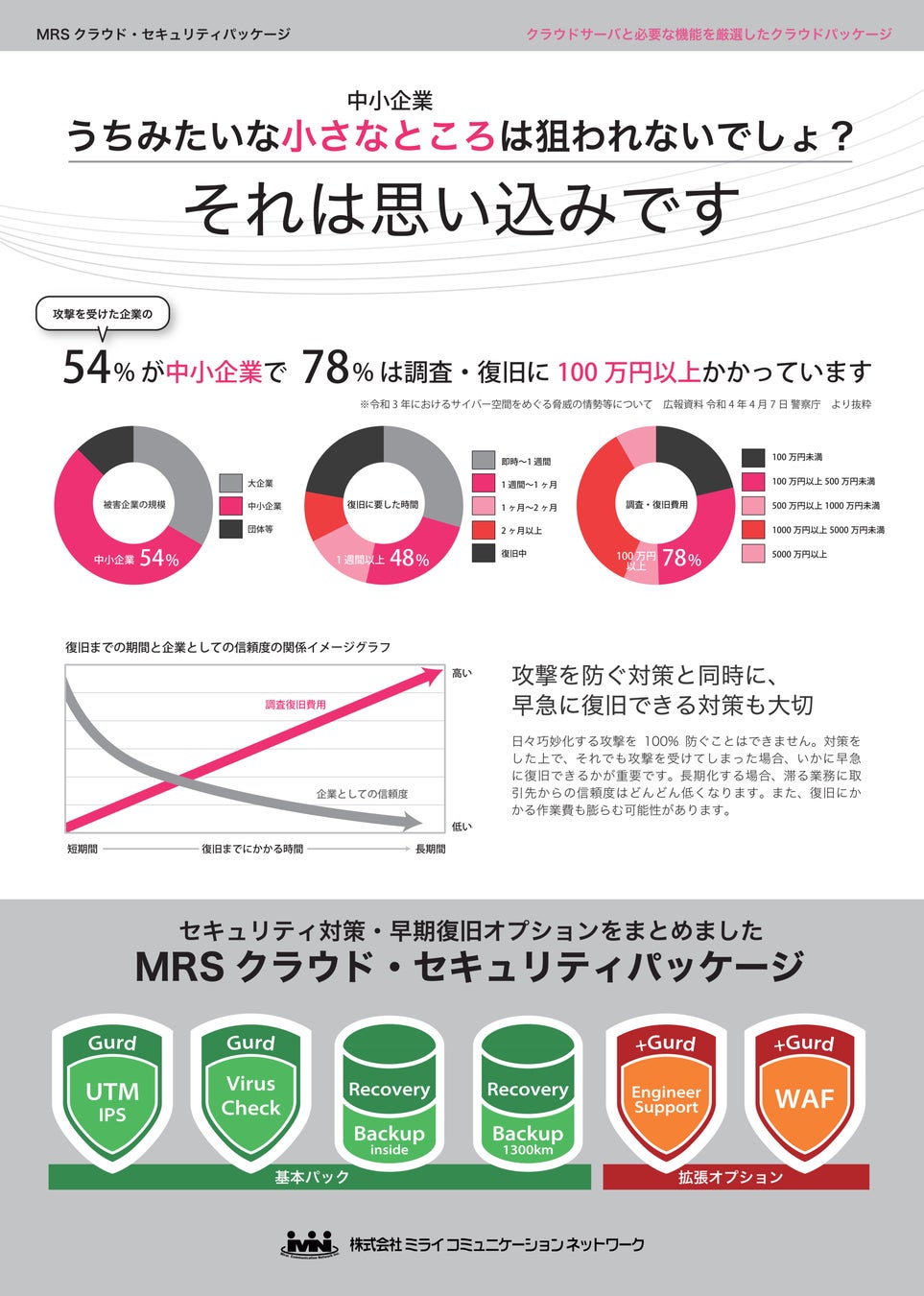 株式会社ミライコミュニケーションネットワーク(岐阜県大垣市、代表取締役:伊藤義仁)は、現在提供中のレンタルサーバサービスの新プランとして、セキュリティ対策・早期復旧オプションがまとまった【MRSクラウド・セキュリティパッケージ】の提供を開始します。