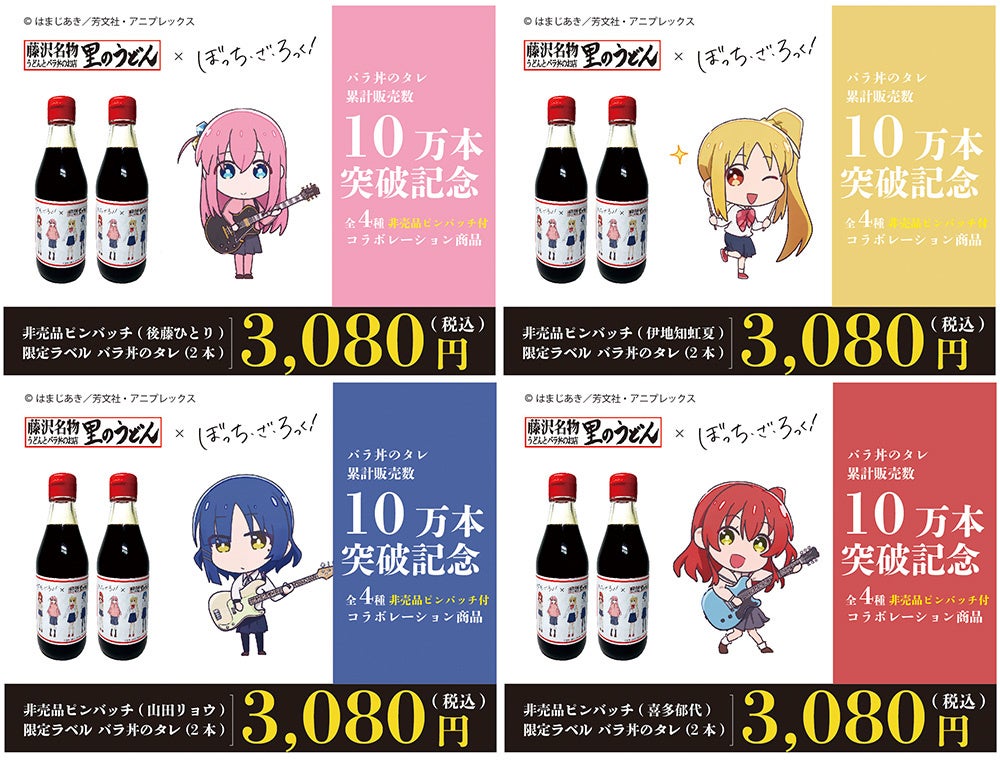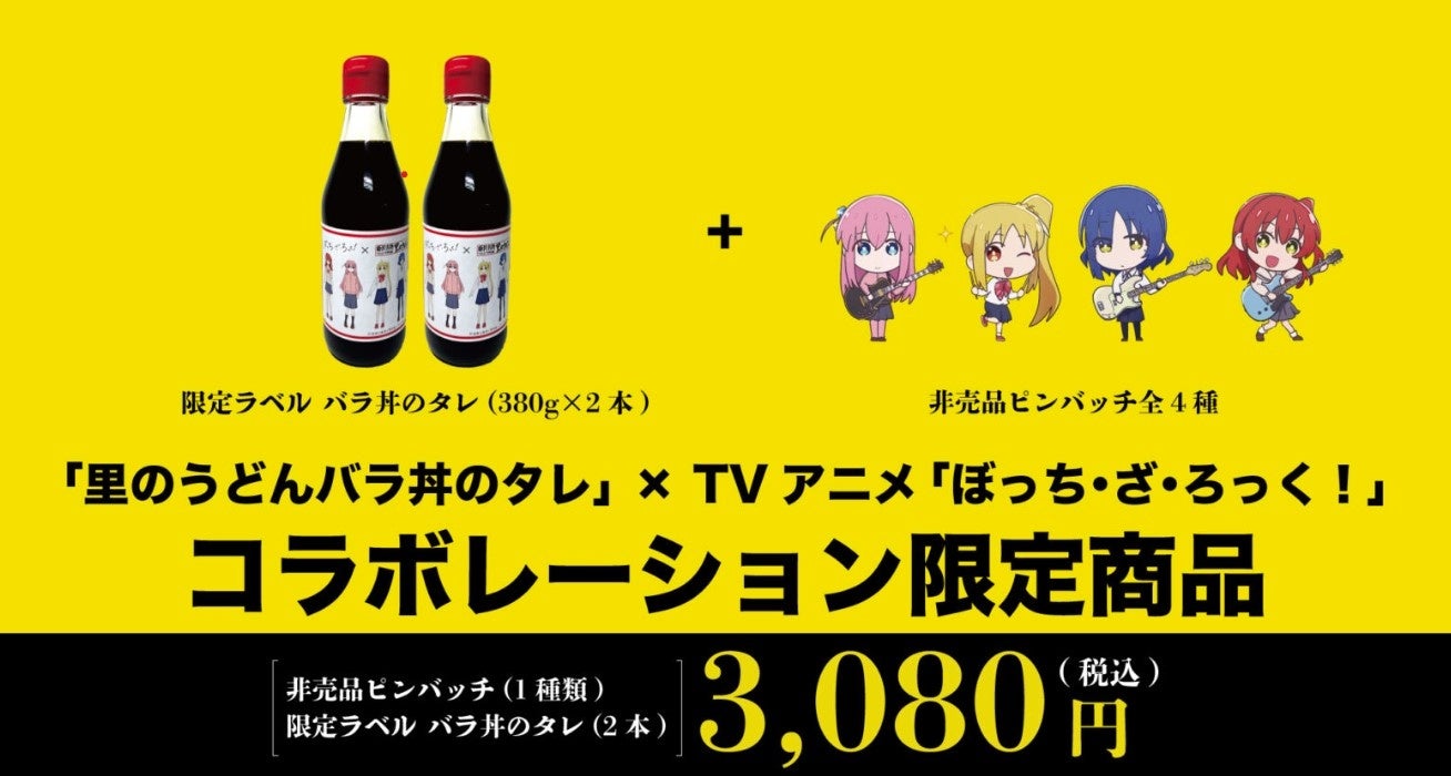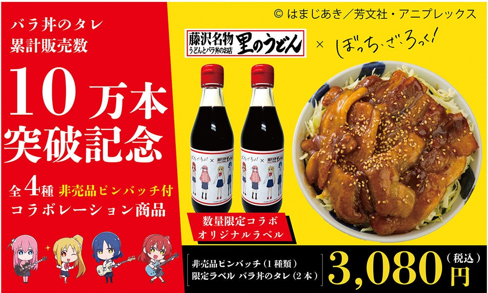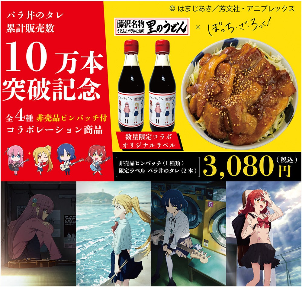 藤沢のご当地グルメ「里のうどんバラ丼のタレ」をオンラインショップで販売する合同会社侍ソース(代表社員:西嶋 芳生)はバラ丼のタレの累計販売数10万本突破を記念し、話題のTVアニメ「ぼっち・ざ・ろっく!」(©はまじあき/芳文社・アニプレックス)とのコラボ商品を販売開始いたします。