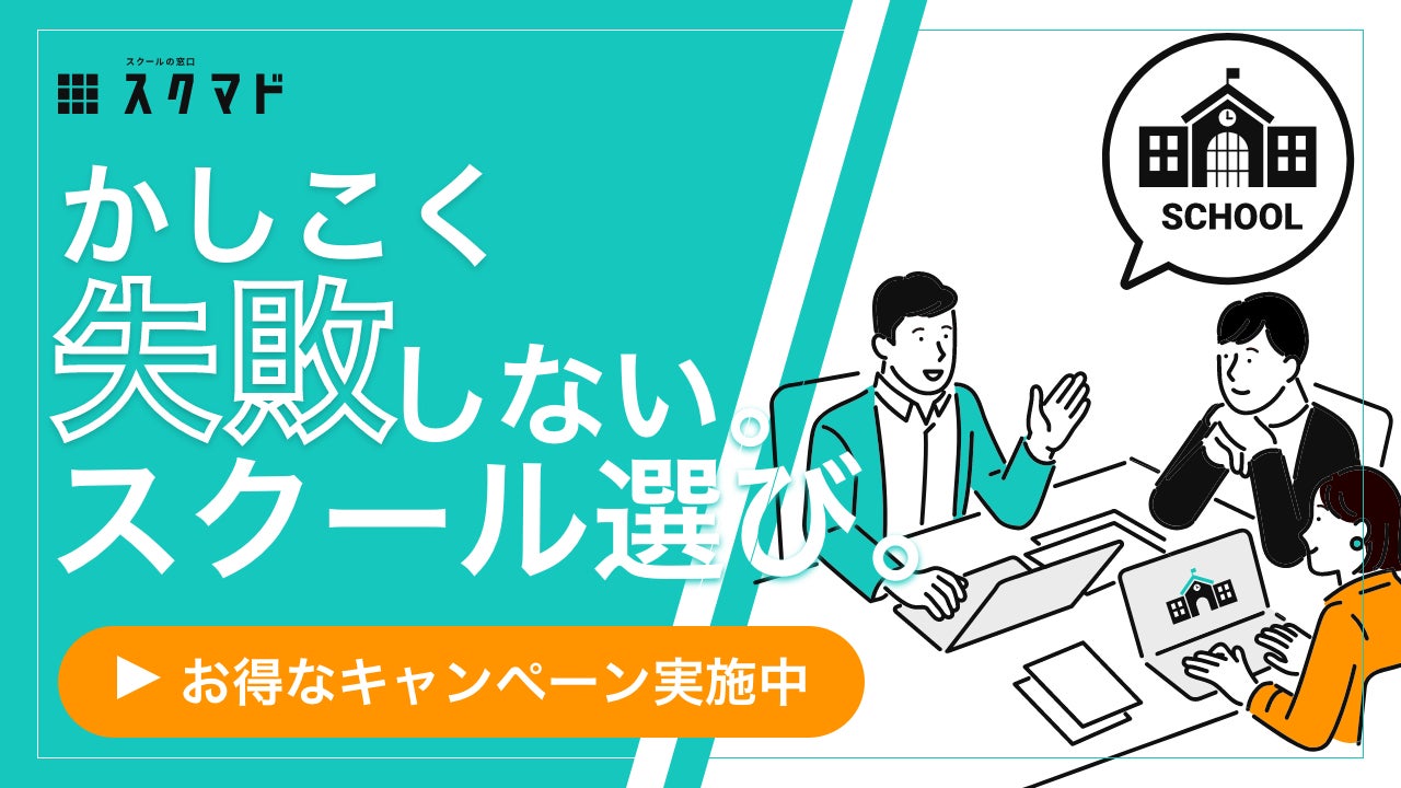 スクマドでは提携スクール様と協力をしスクマド限定特典をご用意。またスクマド独自のキャッシュバックキャンペーンも開催中。スクマド経由であれば通常よりもお安く受講をスタートいただくことが可能です。