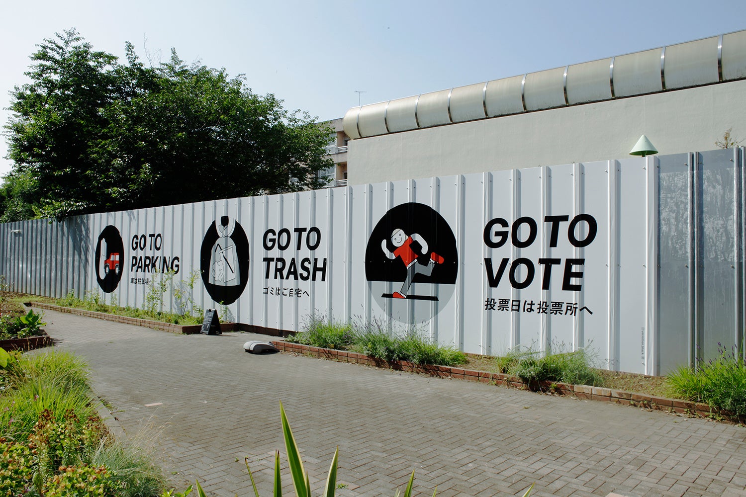 ののあおやまに隣接する旧都営住宅青山北町アパートに設置された仮囲いには、選挙投票率の促進に加え、違法駐車や、タバコやゴミのポイ捨てなどのマナー違反者に対して警鐘を鳴らすメッセージも連ね、社会的な行動を促すようなデザインを掲出します。