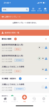 - ホーム画面・・・自分の対応が必要な書類、相手の対応待ち、締結済みなどが一覧できます