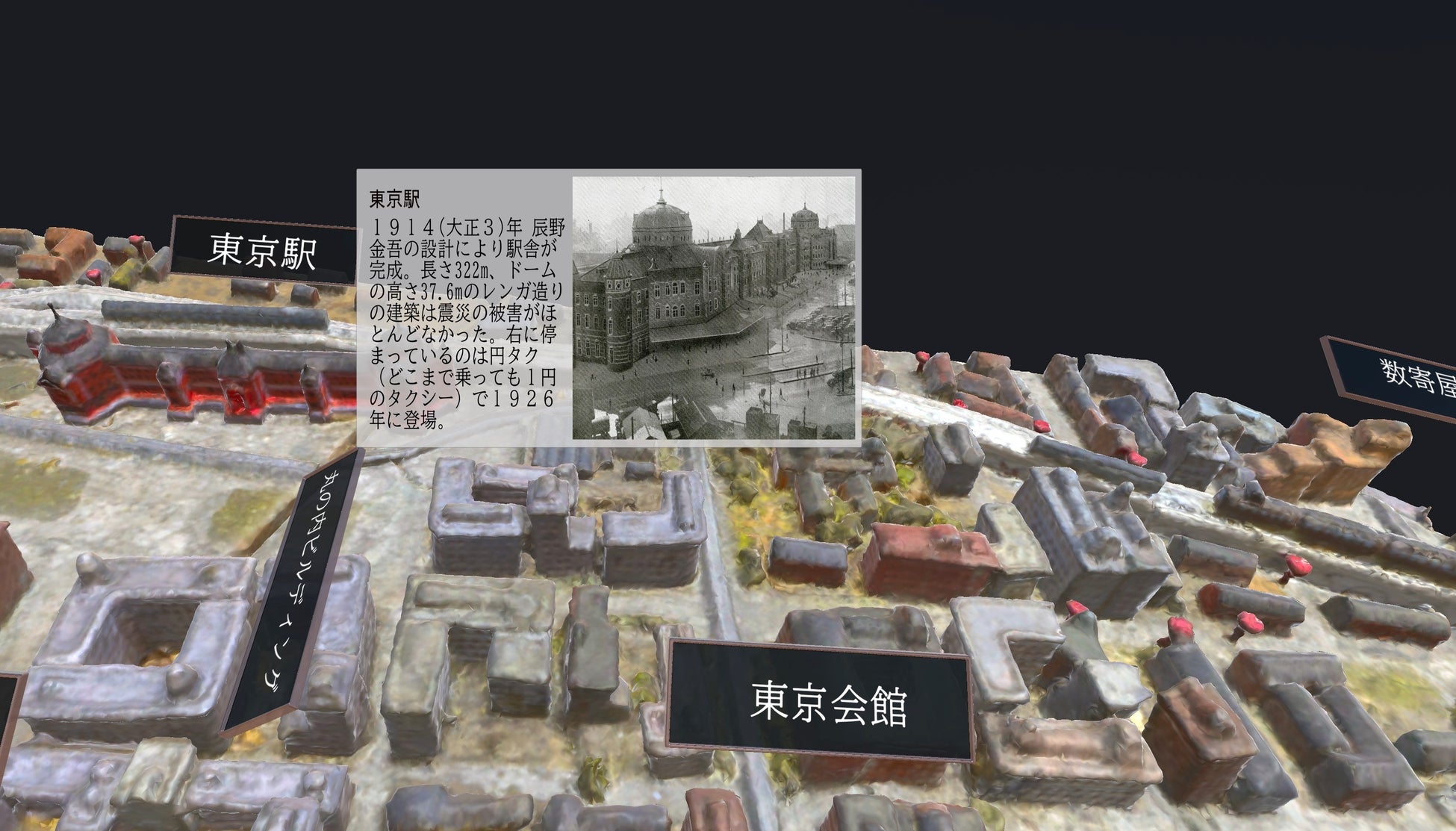 現在、復興記念館に展示されている東京市の復興大模型は、5000分の1の尺度で東京の中心エリアの大部分を約2.5m x 2.5mの大きさで精巧に制作されました。株式会社空創はこの精巧なジオラマを細部に渡って3D化しデジタルで再現しました。再現したVRは株式会社Psychic VR Labが提供するVR/AR/MRクリエイティブプラットフォーム「STYLY」で体験することができます。