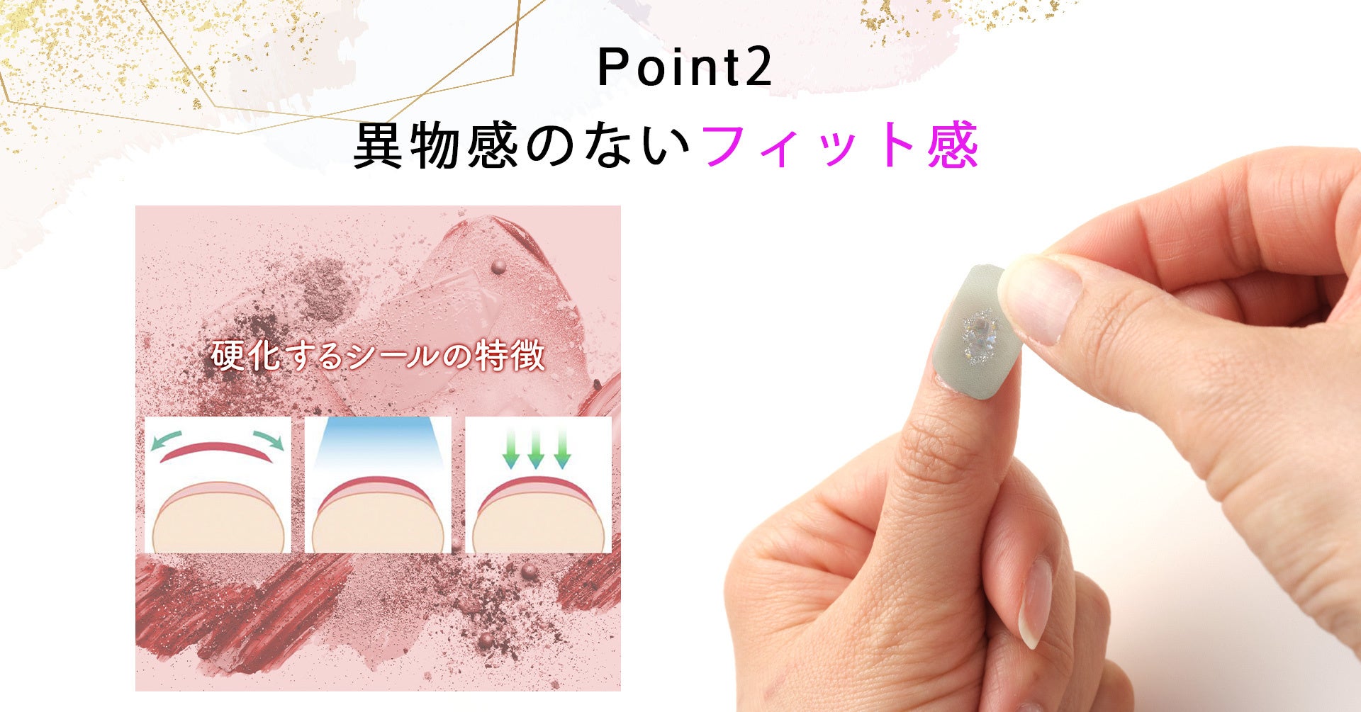 伸縮性のある素材を使用しているから、自爪にしっかりフィットし、硬化するとさらに密着します。