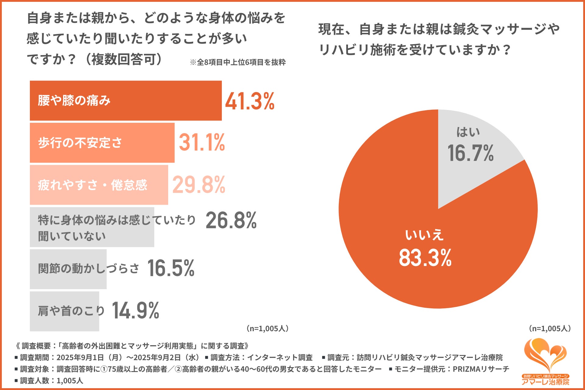 そこで今回、SOSEI Tech株式会社が運営する訪問リハビリ鍼灸マッサージアマーレ治療院(https://www.amare.yokohama/)は、①75歳以上の高齢者/②高齢者の親がいる40〜60代の男女を対象に、「高齢者の外出困難とマッサージ利用実態」に関する調査を行いました。