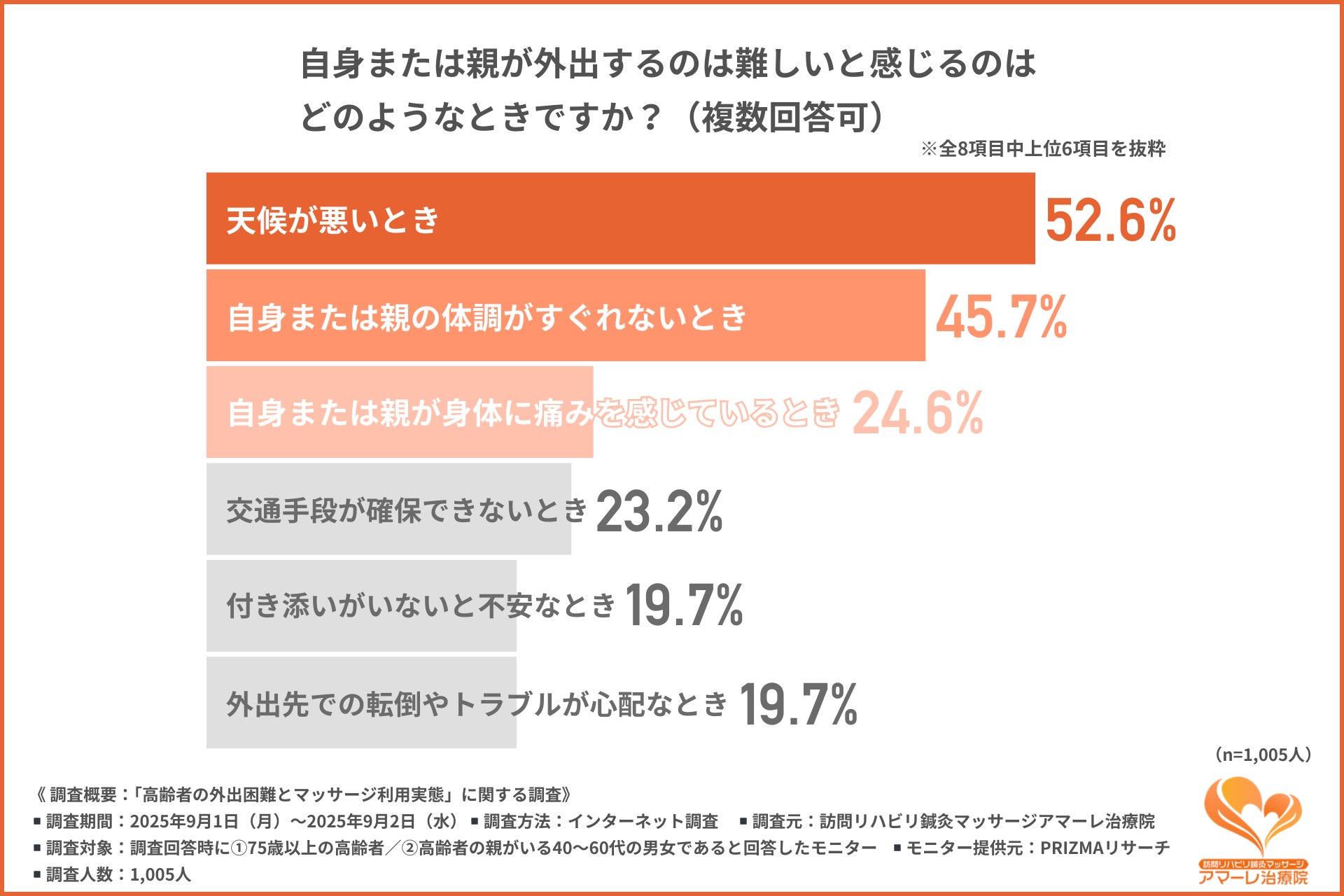 「自身または親が外出するのは難しいと感じるのはどのようなときか」について尋ねたところ、『天候が悪いとき(52.6%)』が最多で、『自身または親の体調がすぐれないとき(45.7%)』『自身または親が身体に痛みを感じているとき(24.6%)』と続きました。