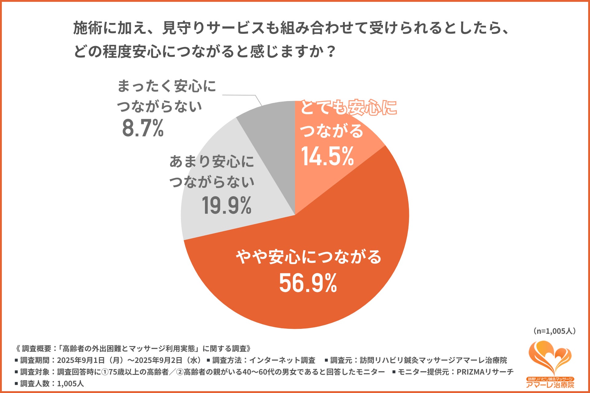 「施術に加え、見守りサービスも組み合わせて受けられるとしたら、どの程度安心につながると感じるか」について尋ねたところ、約7割が『とても安心につながる(14.5%)』『やや安心につながる(56.9%)』と回答しました。