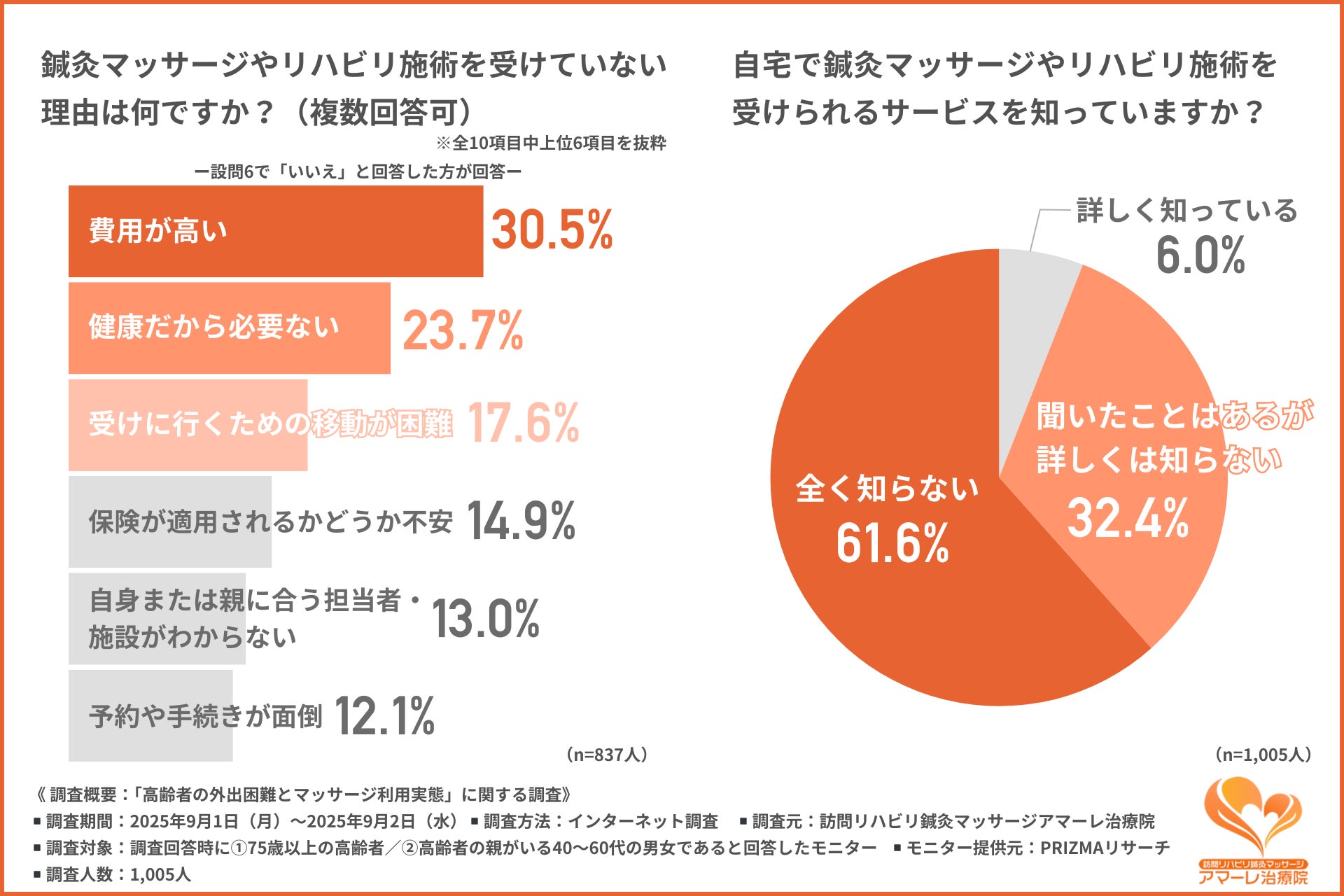 一方で、鍼灸マッサージやリハビリを実際に受けている高齢者は少数にとどまり、その背景には「費用」や「移動の困難」「情報不足」といった要因があることも明らかになりました。特に自宅での施術サービスの認知度は低く、必要な人に届いていない現状が浮かび上がっています。