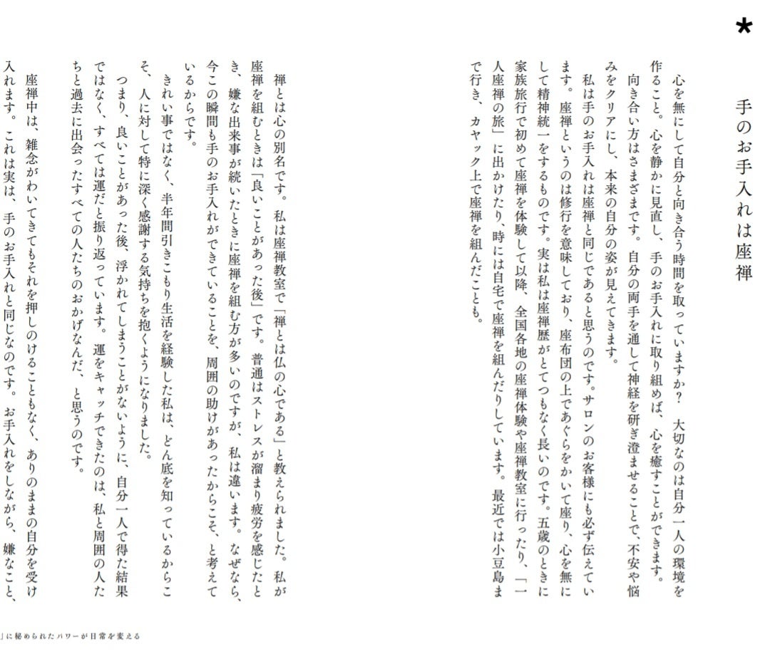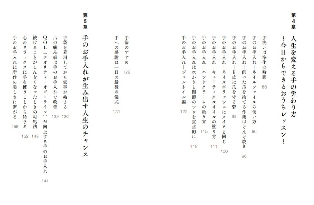 本書では、ネイルの枠を超えた「⼿の美容」に関する書籍として、本当に正しい⼿のお⼿⼊れのやり⽅から、⾃分で未来を切り開く強さが持てる⼼の向き合い⽅を紹介した一冊です。