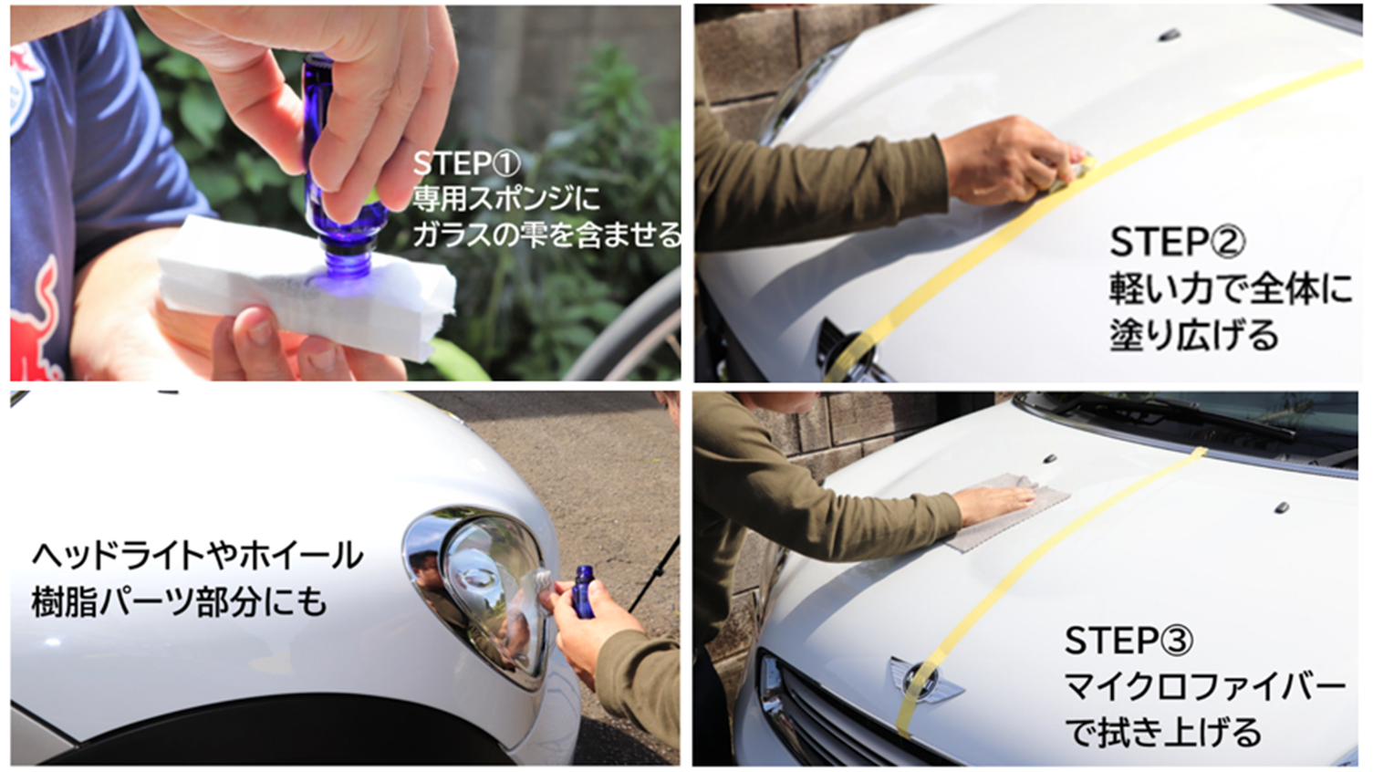 一般エンドユーザーでも簡単4ステップで簡単、安心、素早い施工が完了。DIY(Do It Yourself)ガラスコーティングという新しい発想を広めたい!!