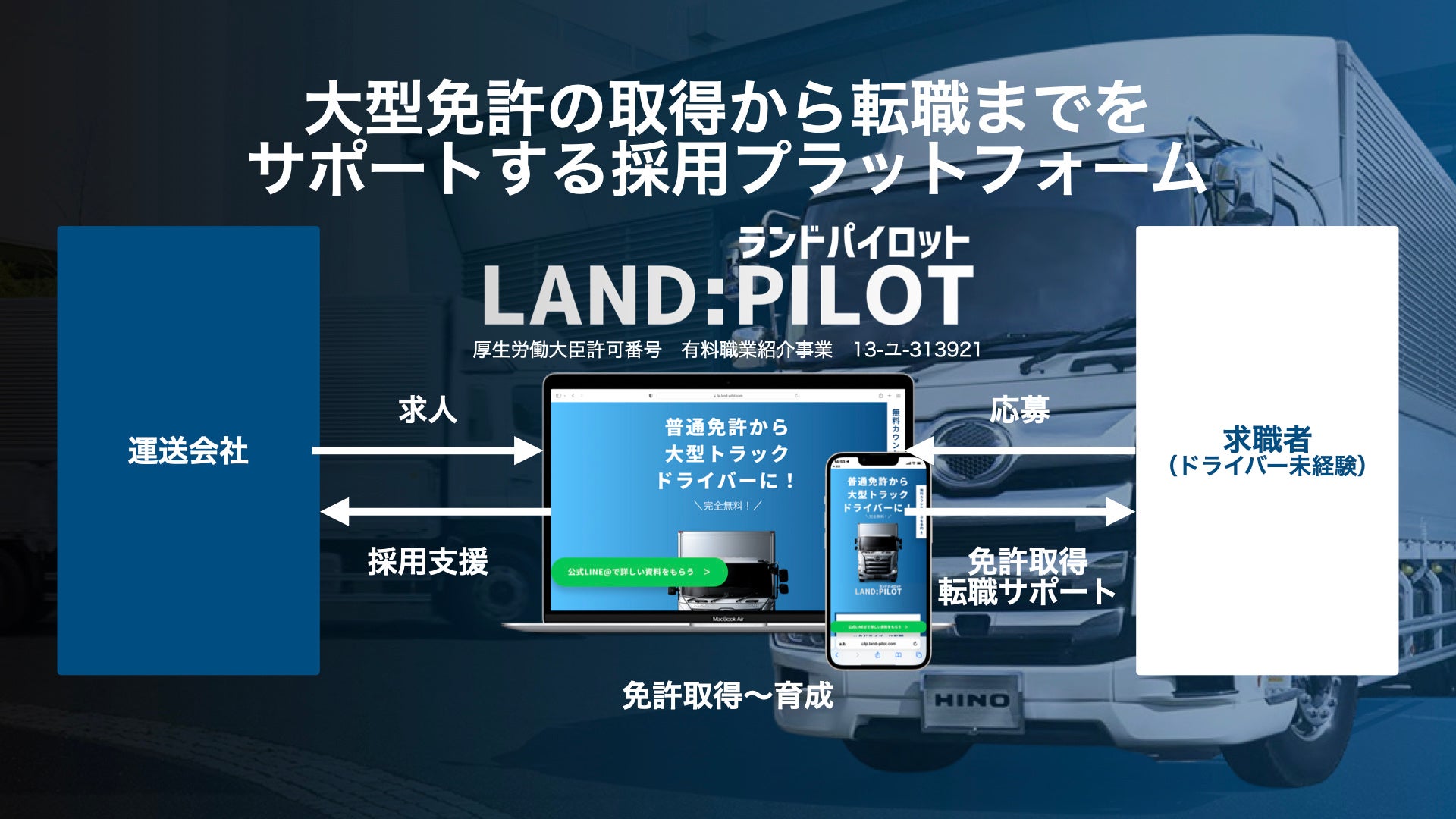 トラックドライバーの人材不足の解決を目的として、未経験者の育成、就職をサポートする採用プラットフォーム『LAND:PILOT』(ランドパイロット)を提供しています。ランドパイロットのプログラムを利用することにより、未経験者は提携の指定教習機関にて無料で大型免許を取得することができ、免許取得後は実際の運送会社でOJTカリキュラムを受講、プロドライバーとして一人立ちするまでの手厚いサポートを受けることができます。