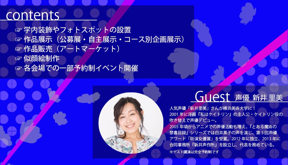 | 概要 | ゲスト講演決定!今年は人気声優「新井里美」さんが横浜美術大学に! ※本講演はチケット予約制です※ 《来歴》 2001年に洋画『私はケイトリン』の主人公・ケイトリン役の吹き替えで声優デビュー。 2005年頃からアニメでの声優活動も増え、『とある魔術の禁書目録』シリーズでは白井黒子の声を演じ、第5回声優アワード「助演女優賞」を受賞。2012年に独立、2013年に合同事務所『新井声作所』を設立し、代表を務めている。 |