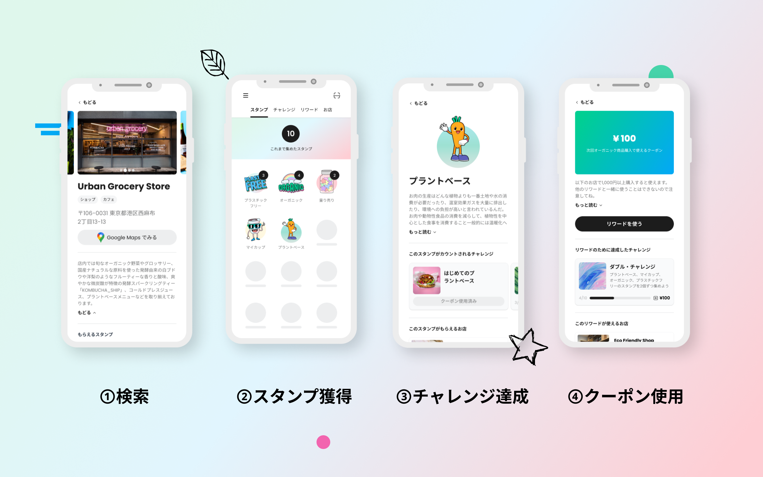 アプリでは環境に配慮した買い物をすることでリワードが与えられるほか、すぐに生活に取り入れられる、簡単な環境に優しいアクションについて学ぶことができます。お得で楽しいからこそ習慣化しやすい、サステナブルな消費行動を「やらなきゃ」から「やりたい」へと変えることを目指すサービスです。