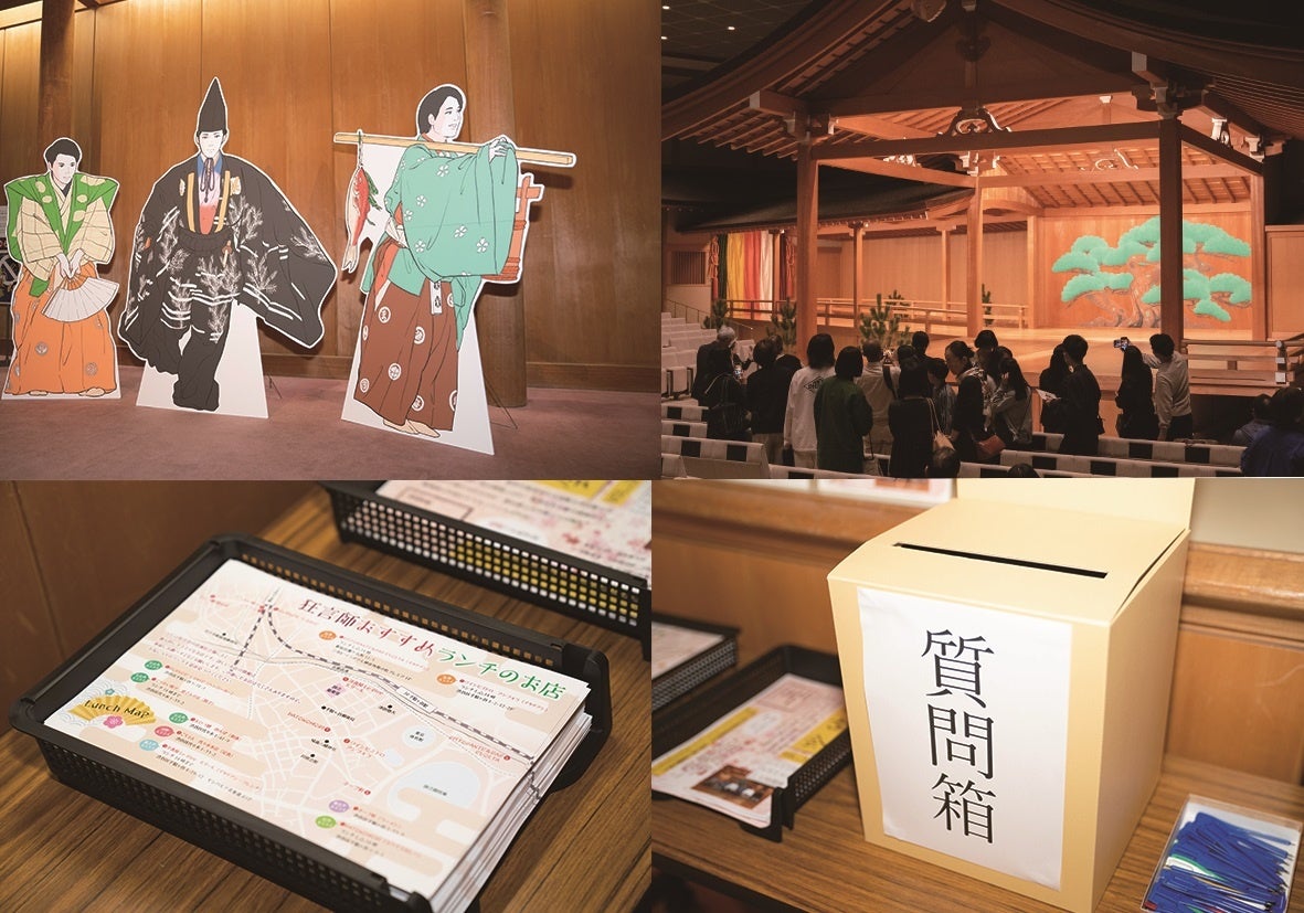 客席に入れば、木造の伝統建築“能舞台”が存在感を現し、開演前や休憩中であれば能舞台をバックに、和風でオシャレな写真も撮ることができます。また、この国立能楽堂(千駄ヶ谷)によく通っている彼らだから教える「狂言師おすすめランチのお店」をランチマップにして無料で配布。公演が昼過ぎに終わるため、そのまま千駄ヶ谷周辺でランチをして、良い休日を過ごして欲しいという思いを込めて作成しました。