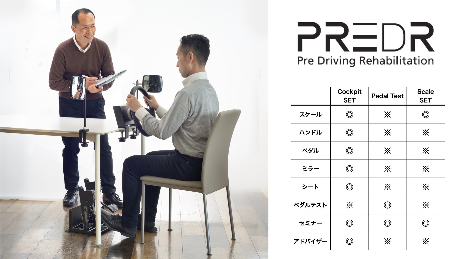 一般的にリハビリテーションを受けて、運転免許に必要な条件を医学的判断と運転免許センターによる検査を通じて条件付与も含めて可否判断が行われています。しかし、専門的な検査を通して説明を受けてもご本人が運転ということを実感できず、自己理解に困惑することもまだまだ多くあります。そこで、限られた環境で屋外では自動車を動かさず、屋内では車環境を再現して運転能力を確かめ、ご自身の持つ運転感覚を実感しながらリハビリテーションに取り組んでいただこうと開発した商品がPREDRシリーズです。