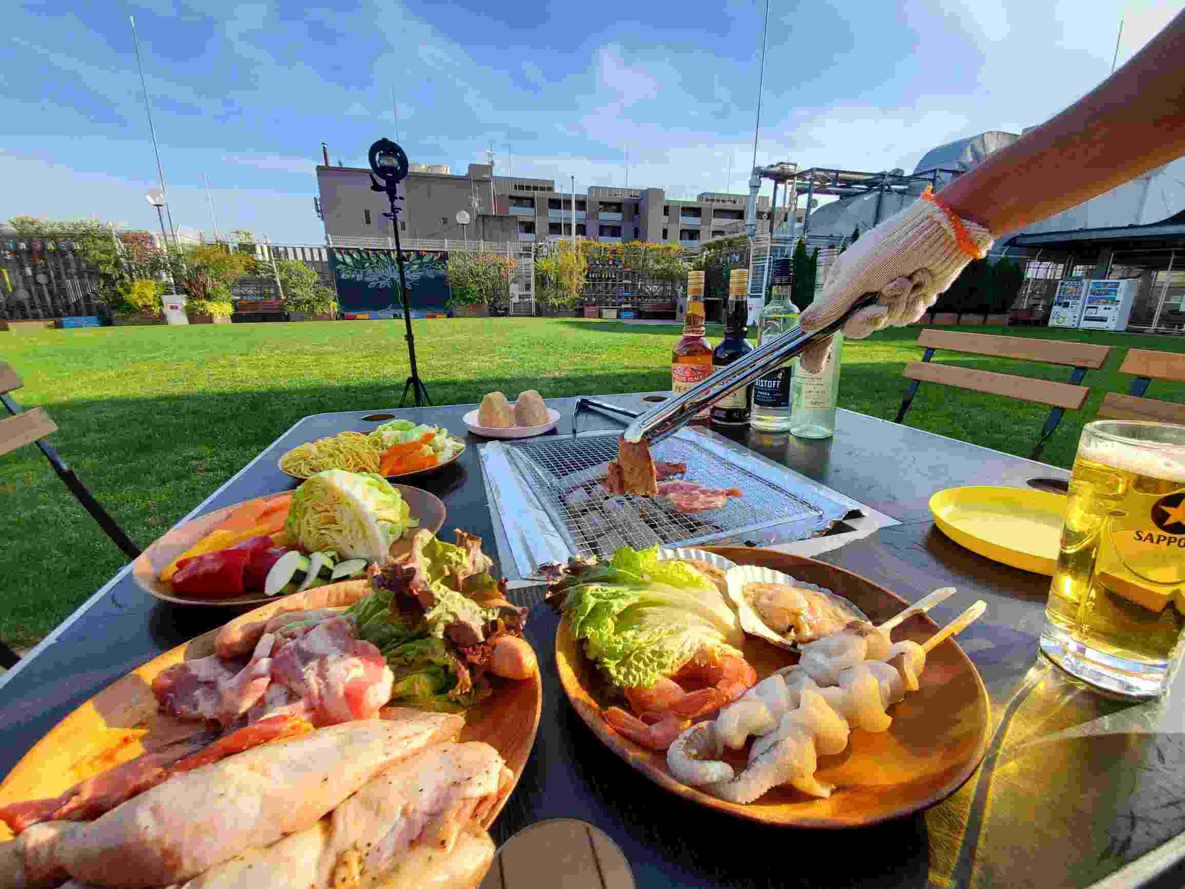 ⼀番のポイントは… 「都会の真ん中で気軽に集える仲間とBBQを楽しめる!」 持ち込んでいただいた⾷材や店舗でご⽤意している⾷材を 会場に設置したバーベキューコンロで焼きながら⾷べていただけます。 ⽚づけいらず、⼿間いらずでBBQお楽しみいただけます。