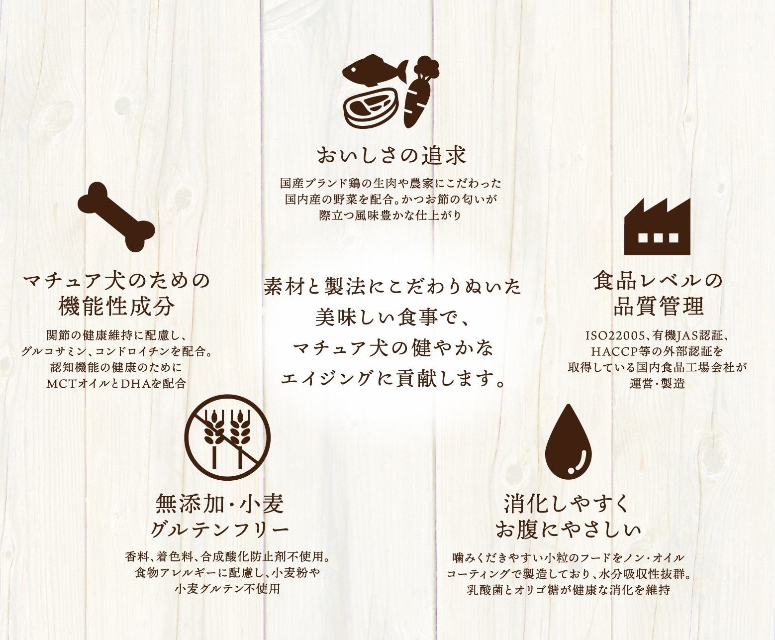 【東大病院 獣医師推薦】7歳以上の愛犬=マチュア犬のための特別なレシピで、国産ブランド鶏や機能性成分原料を贅沢に使用。