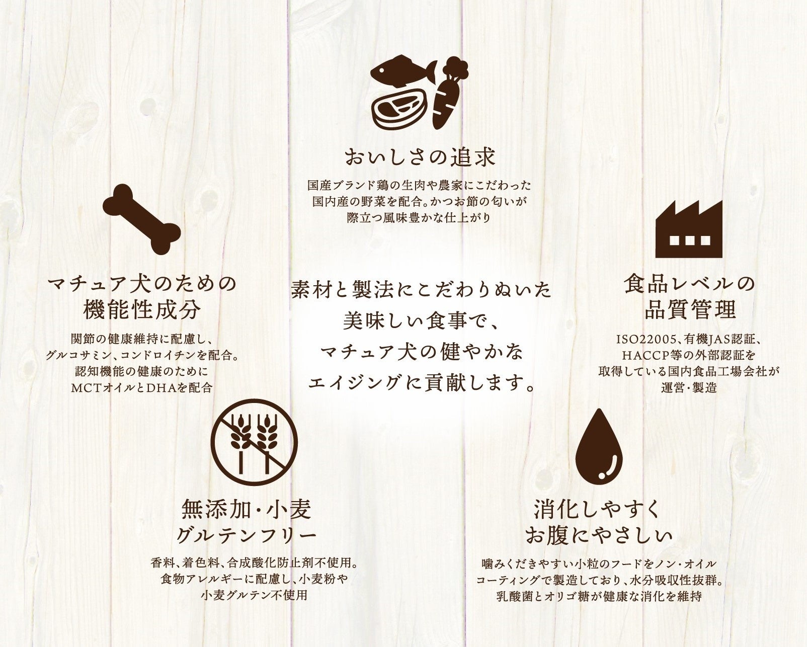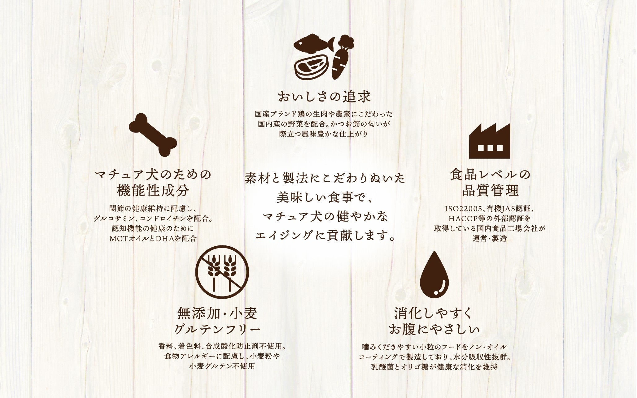 人間の食品と異なり、365日同じものだけを食べ続けるからこそ、おいしさはもちろん、マチュア犬の健康維持に配慮した様々な特長にこだわり、徹底した品質管理でお客様の元にお届けいたします。