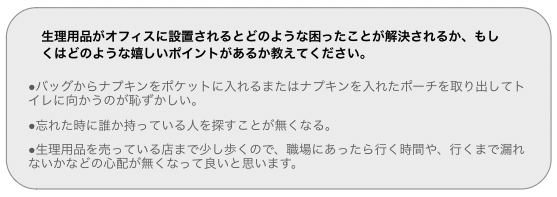 このような状況を受け、生理用品のオフィス常設サービス「サニパ」の提供を開始することで、身体的女性の負担の軽減を支援いたします。
