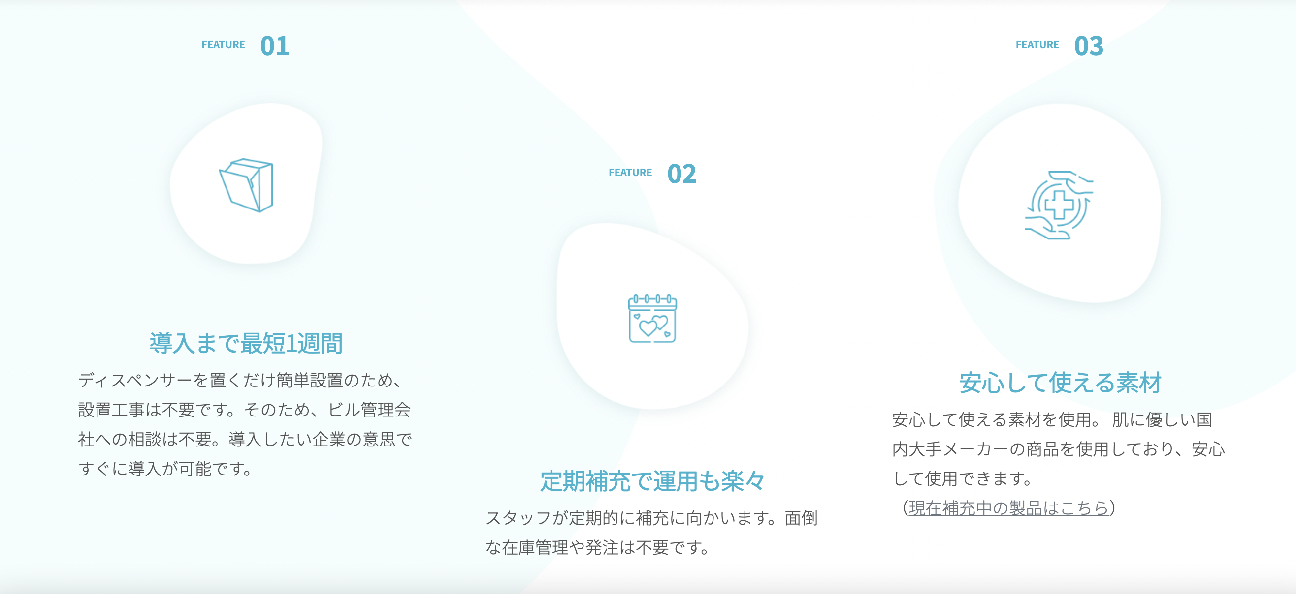 また、ディスペンサー設置時は工事不要であり、企業用のトイレ内に設置するため、各企業の意思で導入することが可能です。従業員が自己負担なく自由に生理用品を使えるようにすることで、企業の働きやすいオフィス実現を支援いたします。