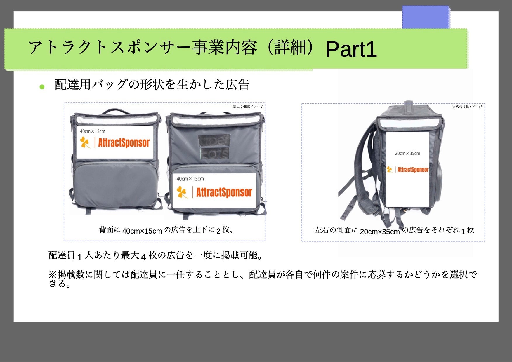 1.配達用バッグの約40センチ×40センチのスペースに広告を掲示できる。