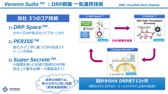 DRPの機能性ペプチドとしての有用性に着目し、国立研究開発法人産業技術総合研究所で開発された膜タンパク質を標的とするDRPの探索手法と、簡便で安価な合成法を組合せ構築したDRP創薬システムです。Veneno SuiteTMは3つのコア技術から成ります: