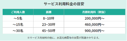 毎月の支払いは、月額のサービス利用料と水道光熱費等の実費のみです。通常の賃貸オフィスに必要な契約時初期費用(敷金・礼金・仲介手数料)や、入退去時の工事費用、家具購入費用はかかりません。キャッシュフローが安定し、資金計画が立てやすくなります。