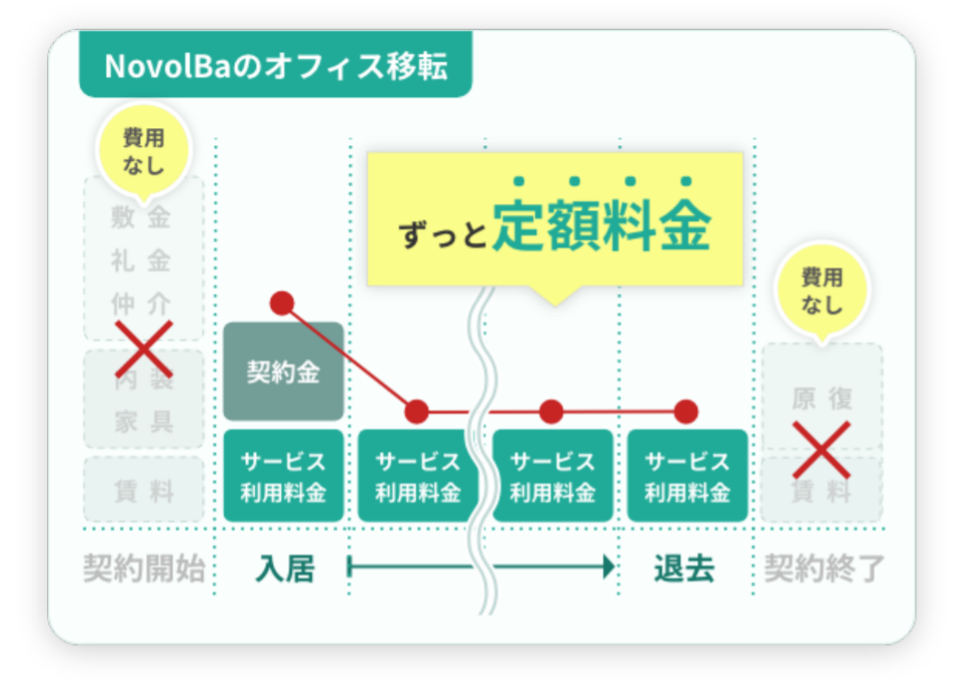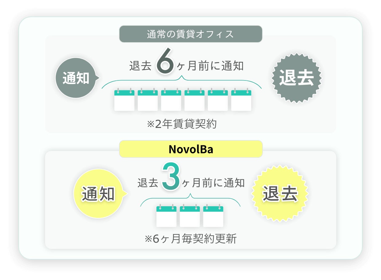 通常の賃貸オフィスは2年契約、6カ月前の退去予告が必要ですが、NovolBaとの契約は6カ月毎更新、3カ月前予告で退去できます。契約期間に縛られず、スピーディーな拡張移転が可能です。